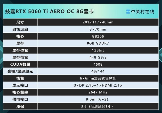 技嘉RTX 5060 Ti AERO OC 8G显卡的尺寸为281×117×40mm,全体紧凑的盘算推算对中小机箱也有可以的兼容性,无需牵挂装机空间问题。