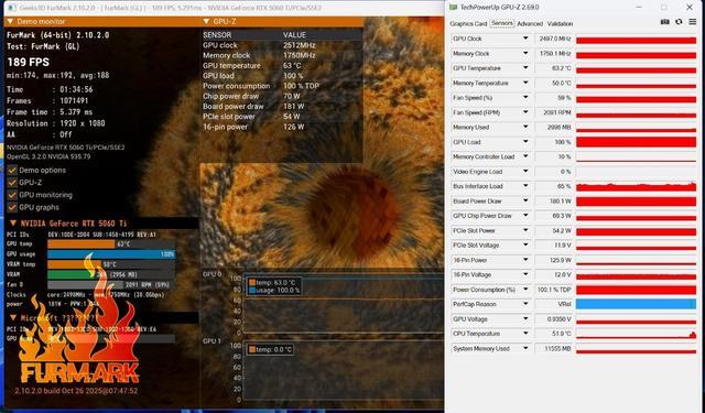 最后咱们使用FurMark 2对技嘉RTX5060 Ti AERO OC 8G显卡进行长达30分钟的满负载压力测试,监测其功耗、中枢温度、显存温度及频率进展,测验其散热与能效比。