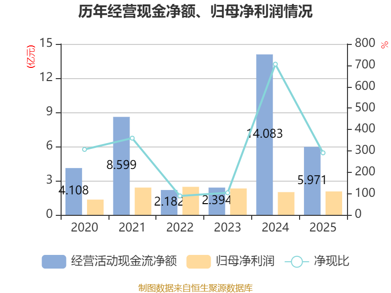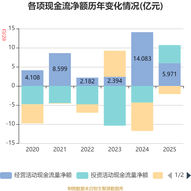 扫尾2025年,公司蓄意行径现款流净额为5.97亿元,同比下落57.6%;筹资行径现款流净额-2.12亿元,同比加多5.33亿元;投资行径现款流净额4.73亿元,上年同时为-4.34亿元。