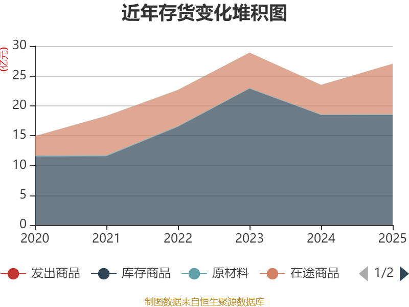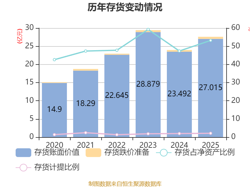 从存货变动来看,扫尾2025年末,公司存货账面价值为27.01亿元,占净钞票的53.19%,较上年末加多3.52亿元。其中,存货跌价准备为5836.88万元,计提比例为2.11%。