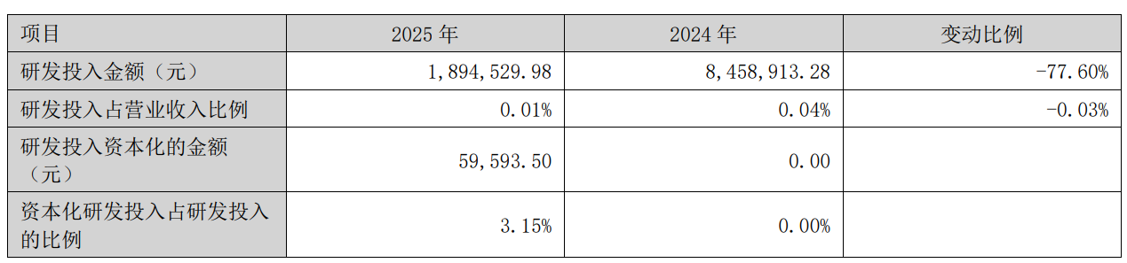 2025年全年,公司研发干涉金额为189.45万元,同比下落77.6%;研发干涉占贸易收入比例为0.01%,比拟上年同时下落0.03个百分点。此外,公司全年研发干涉成本化率为3.15%。